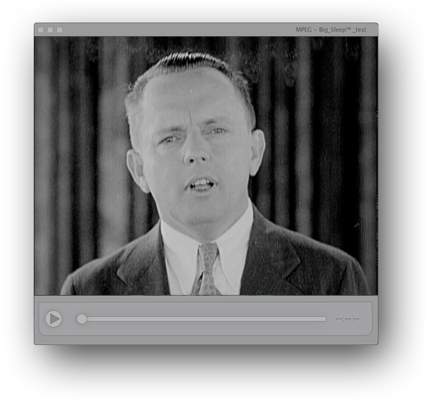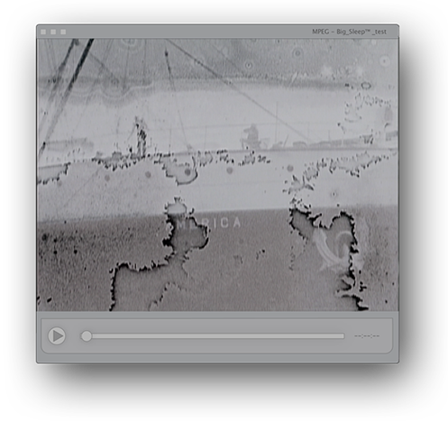 Big_Sleep™ explores problems in our archival urges. Via a single-channel desktop screencast, informatic elements ebb and flow—creating and relating interface absences. These gaps suggest that no amount of hard drive space can defy mortality. The only way to fully prepare our media for the future is to prepare ourselves for a future apart. The piece presents material from the late William Birch, one of the most important Fox Movietone cinema- tographers. Examining his now-decaying body of work—we find an argument for access in the present. Digital migrations of these early films are often met with limited, temporary success. Looking into the future, one might see a canon of obsolesce. Looking further, one might not see anything at all.